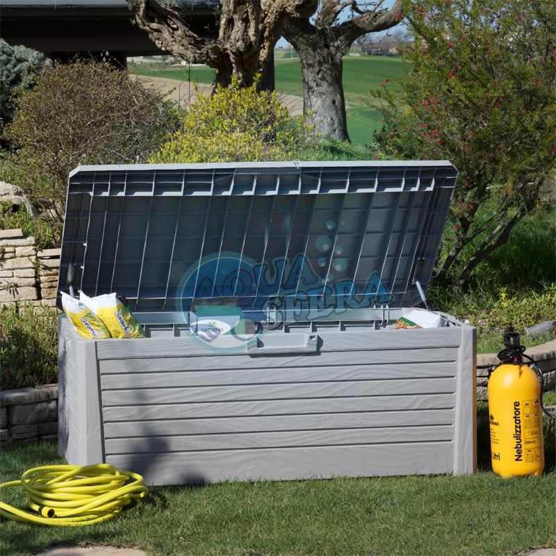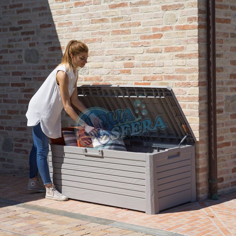 skrzynia wykonana jest w całości z tworzywa sztucznego w odcieniu jasno szarym o strukturze naturalnego drewna,